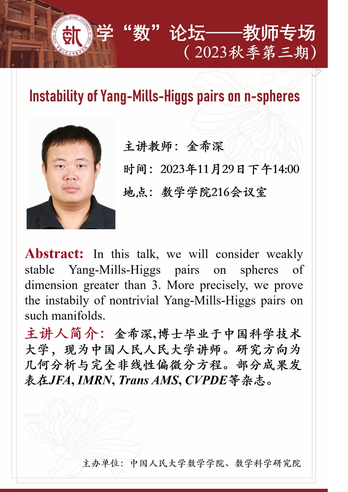 教师专场的第三期报告将于2023年11月29日下午14:00在91黑料 216会议室举行,本场报告的主讲教师为金希深,报告题目为《Instability of Yang-Mills-Higgs pairs on n-spheres》。