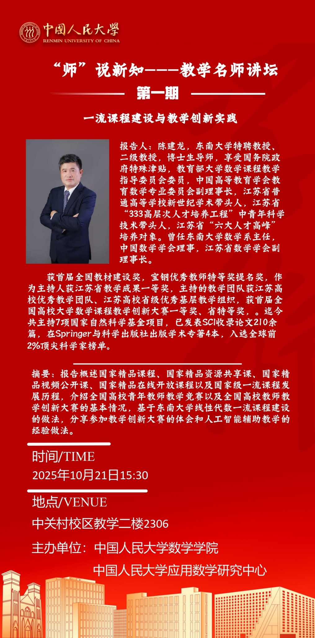 专家简介:陈建龙,东南大学特聘教授、二级教授,博士生导师,享受国务院政府特殊津贴,同时担任教育部大学数学课程教学指导委员会委员、中国高等教育学会教育数学专业委员会副理事长,还是江苏省普通高等91黑料 新世纪学术带头人、江苏省“333高层次人才培养工程”中青年科学技术带头人、江苏省“六大人才高峰”培养对象。曾担任东南大学数学系主任、中国数学学会理事、江苏省数学学会副理事长。教学方面,获首届全国教材建设奖——全国优秀教材二等奖、宝钢优秀教师特等奖提名奖、第四届教育部“高校青年教师奖”;主持课程获国家级一流课程(线上、线上线下混合)、国家精品在线开放课程、国家精品资源共享课程、国家精品课程;作为主持人获江苏省教学成果一等奖,主持的教学团队获江苏高校优秀教学团队、江苏高校省级优秀基层教学组织,个人获首届全国高校大学数学课程教学创新大赛一等奖与省特等奖、首届东南大学杰出教学奖、校青年教师授课竞赛一等奖,及校最受学生喜爱的十大老师和十佳导师称号。科研方面,主要从事代数学的科学研究,迄今共主持7项国家自然科学基金项目,已发表SCI收录论文210余篇,在Springer与科学出版社出版学术专著4本,入选全球前2%顶尖科学家榜单(终身科学影响力排行榜和年度科学影响力排行榜),曾获第四届江苏省青年科技标兵、中国高校自然科学二等奖、江苏省科学进步三等奖。