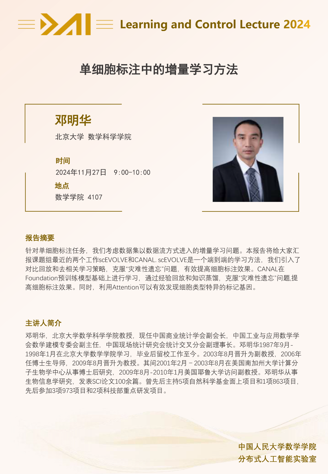 针对单细胞标注任务,我们考虑数据集以数据流方式进入的增量学习问题。本报告将给大家汇报课题组最近的两个工作scEVOLVE和CANAL. scEVOLVE是一个端到端的学习方法,我们引入了对比回放和去相关学习策略,克服“灾难性遗忘”问题,有效提高细胞标注效果。CANAL在Foundation预训练模型基础上进行学习,通过经验回放和知识蒸馏,克服“灾难性遗忘”问题,提高细胞标注效果。同时,利用Attention可以有效发现细胞类型特异的标记基因。