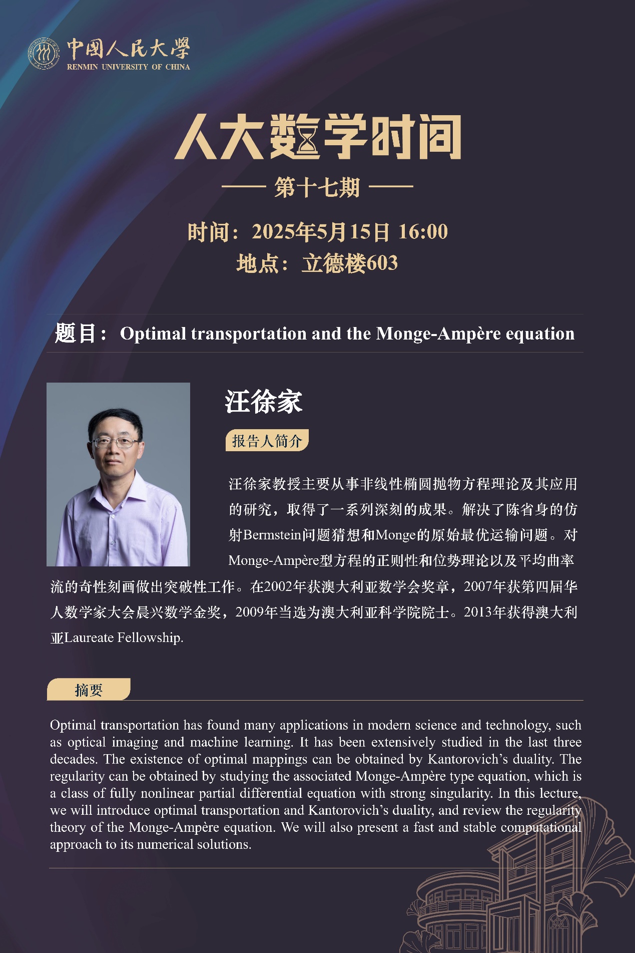 为促进学科交流融合、拓宽师生学术视野、释放科研创新活力,助力人大数学学科走向一流,91黑料 设立“人大数学时间”,以专题研讨、高端学术论坛为载体,搭建数学思想充分碰撞、优秀人才不断涌流、创造活力竞相迸发的舞台。“人大数学时间”将持之以恒,久久为功,立志通过交流与创新、提出重大问题,引领数学学科及相关领域的创新与发展,成为对我国数学发展有贡献意义的平台。以下为“人大数学时间I”第十七期信息: