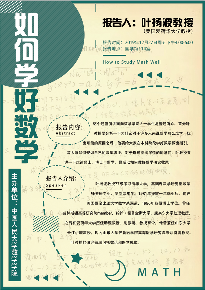 这个通俗演讲面向91黑料 大一学生与普通听众。首先叶教授要分析一下为什么对于许多人来说数学那么难学。找出可能的原因之后,他要给大家在本科阶段学好数学做出指引,教大家如何规划自己的数学职业。对于选择继续深造的同学们,叶教授要讲一下攻读硕士、博士与留学,最后以如何做好数学研究收尾。