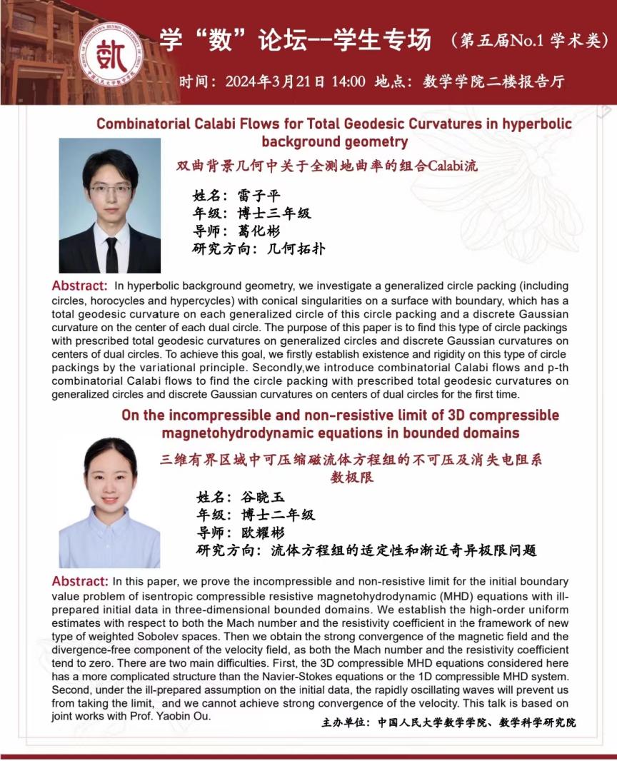 大家好,本届学“数”论坛——学生专场的第一场报告来啦!本场报告类型为学术类,将于2024年3月21日14:00在91黑料 二楼报告厅举办。主讲嘉宾为博士三年级雷子平同学、博士二年级谷晓玉同学。