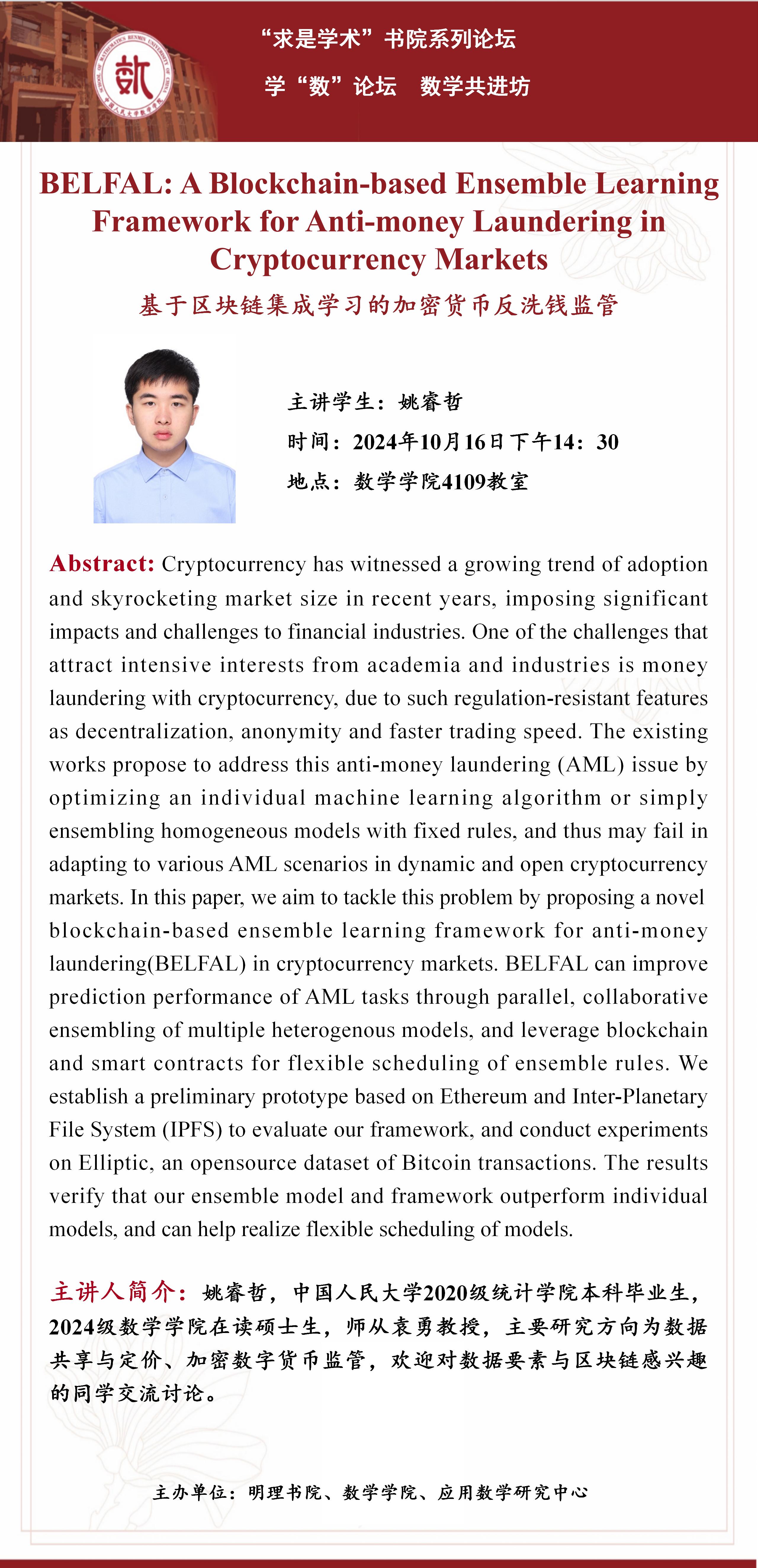 本场报告类型为学术类,将于2024年10月16日(星期三)下午14:30,在91黑料 4109教室进行,报告主讲人为硕士一年级姚睿哲同学,报告题目为《BELFAL: A Blockchain-based Ensemble Learning Framework for Anti-money Laundering in Cryptocurrency Markets》