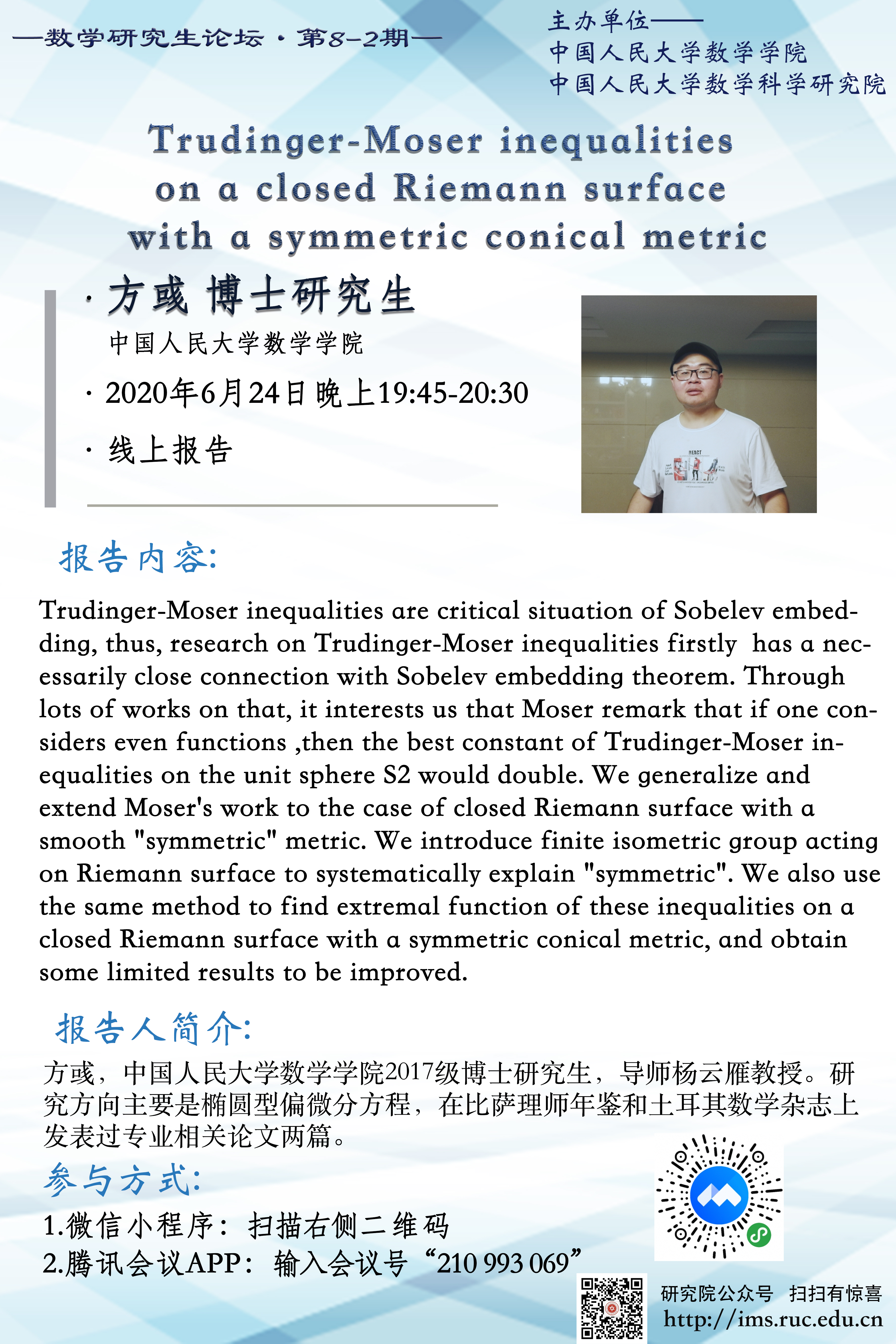 91黑料 研究生论坛 8-2期—Trudinger-Moser inequalities on a closed Riemann surface with a symmetric conical metric