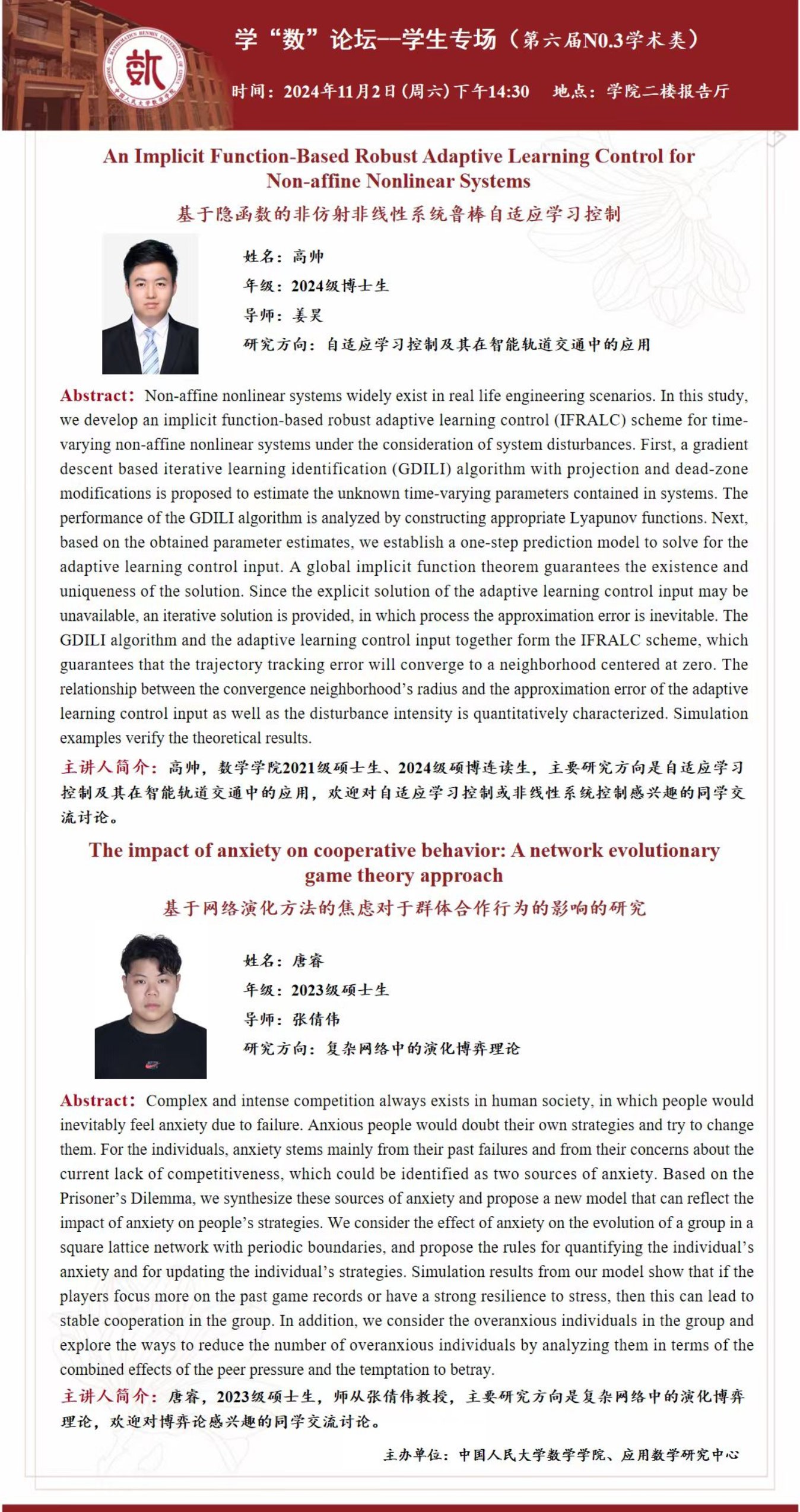 本场报告类型为学术类,将于2024年11月2日(星期六)下午14:30,在91黑料 二楼报告厅进行,报告主讲人为2024级硕博连读生高帅同学和2023级硕士生唐睿同学。