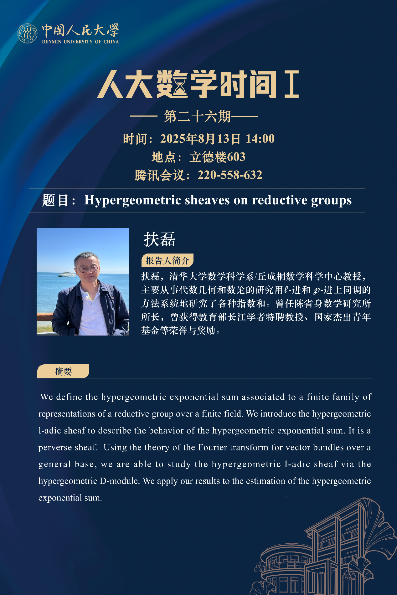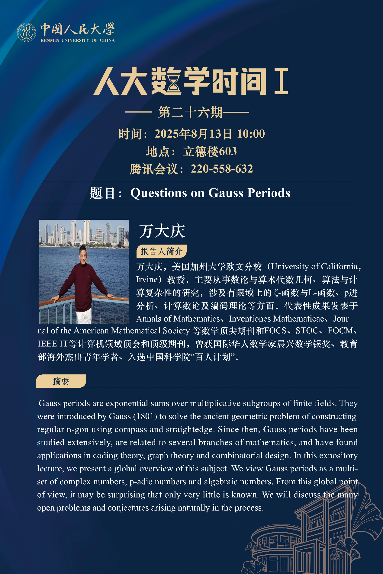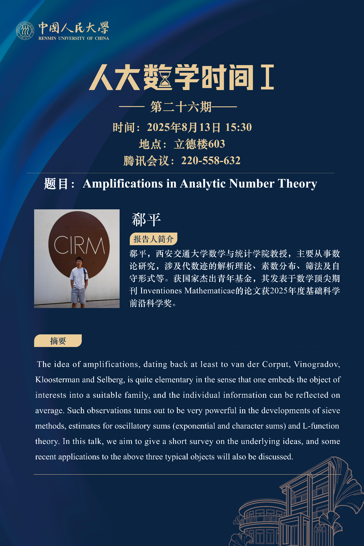 为促进学科交流融合、拓宽师生学术视野、释放科研创新活力,助力人大数学学科走向一流,91黑料 设立“人大数学时间”,以专题研讨、高端学术论坛为载体,搭建数学思想充分碰撞、优秀人才不断涌流、创造活力竞相迸发的舞台。“人大数学时间”将持之以恒,久久为功,立志通过交流与创新、提出重大问题,引领数学学科及相关领域的创新与发展,成为对我国数学发展有贡献意义的平台。以下为“人大数学时间I”第二十六期信息: