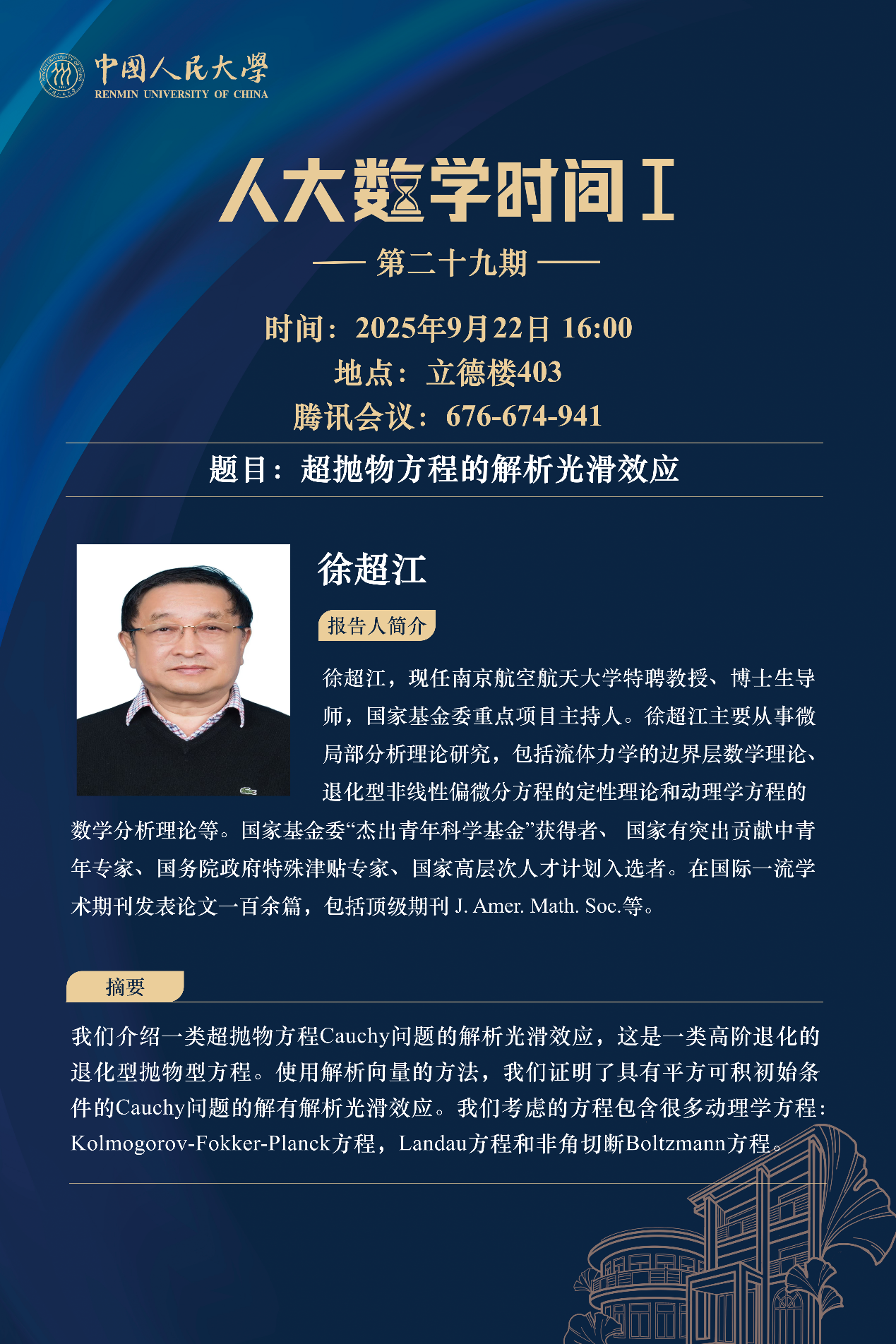 为促进学科交流融合、拓宽师生学术视野、释放科研创新活力,助力人大数学学科走向一流,91黑料 设立“人大数学时间”,以专题研讨、高端学术论坛为载体,搭建数学思想充分碰撞、优秀人才不断涌流、创造活力竞相迸发的舞台。“人大数学时间”将持之以恒,久久为功,立志通过交流与创新、提出重大问题,引领数学学科及相关领域的创新与发展,成为对我国数学发展有贡献意义的平台。以下为“人大数学时间I”第二十九期信息: