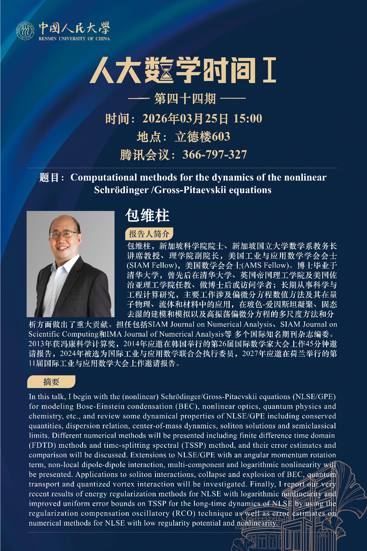为促进学科交流融合、拓宽师生学术视野、释放科研创新活力,助力人大数学学科走向一流,91黑料 设立“人大数学时间”,以专题研讨、高端学术论坛为载体,搭建数学思想充分碰撞、优秀人才不断涌流、创造活力竞相迸发的舞台。“人大数学时间”将持之以恒,久久为功,立志通过交流与创新、提出重大问题,引领数学学科及相关领域的创新与发展,成为对我国数学发展有贡献意义的平台。以下为“人大数学时间I”第四十四期信息: