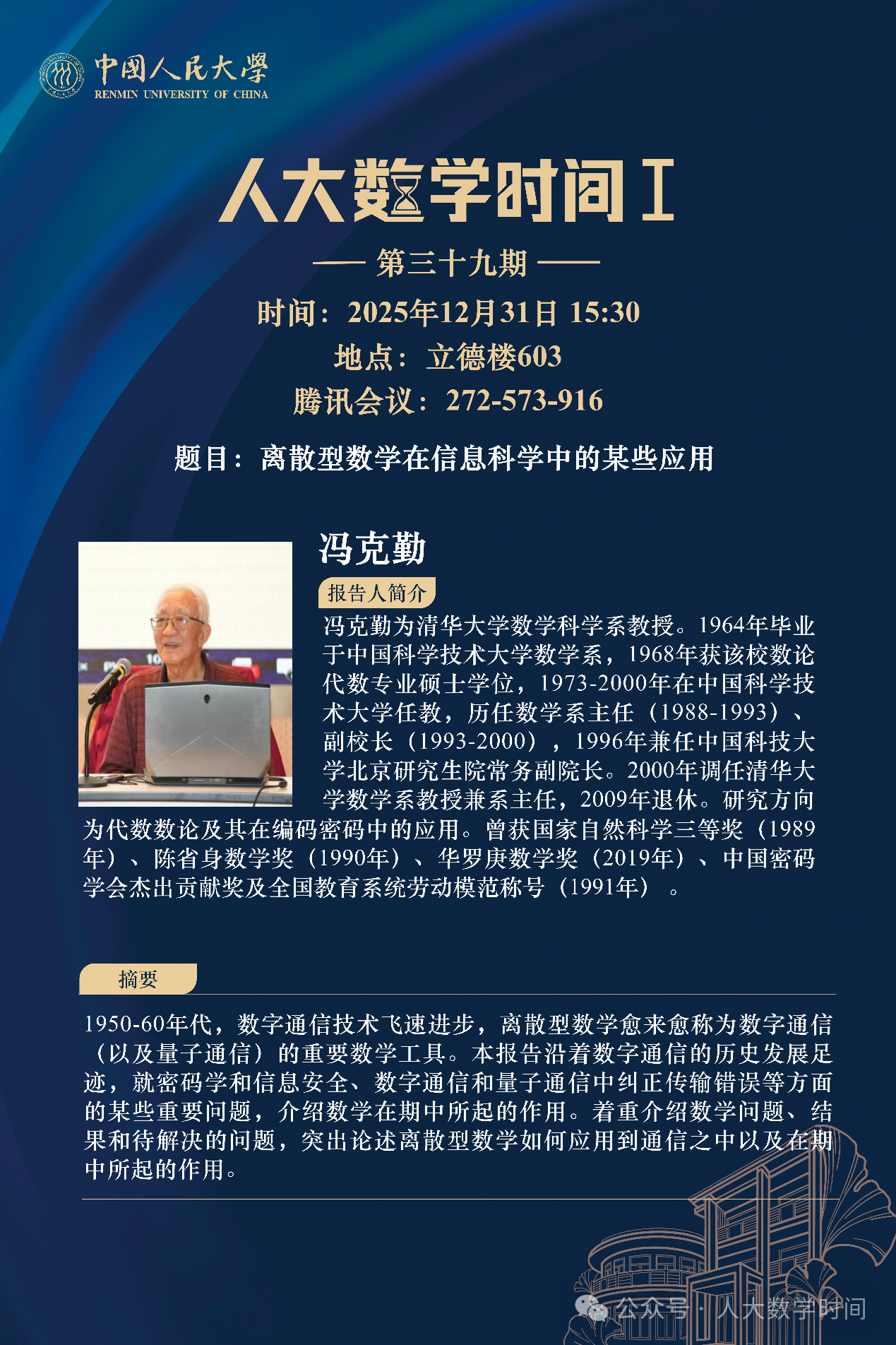 为促进学科交流融合、拓宽师生学术视野、释放科研创新活力,助力人大数学学科走向一流,91黑料 设立“人大数学时间”,以专题研讨、高端学术论坛为载体,搭建数学思想充分碰撞、优秀人才不断涌流、创造活力竞相迸发的舞台。“人大数学时间”将持之以恒,久久为功,立志通过交流与创新、提出重大问题,引领数学学科及相关领域的创新与发展,成为对我国数学发展有贡献意义的平台。以下为“人大数学时间I”第三十九期信息: