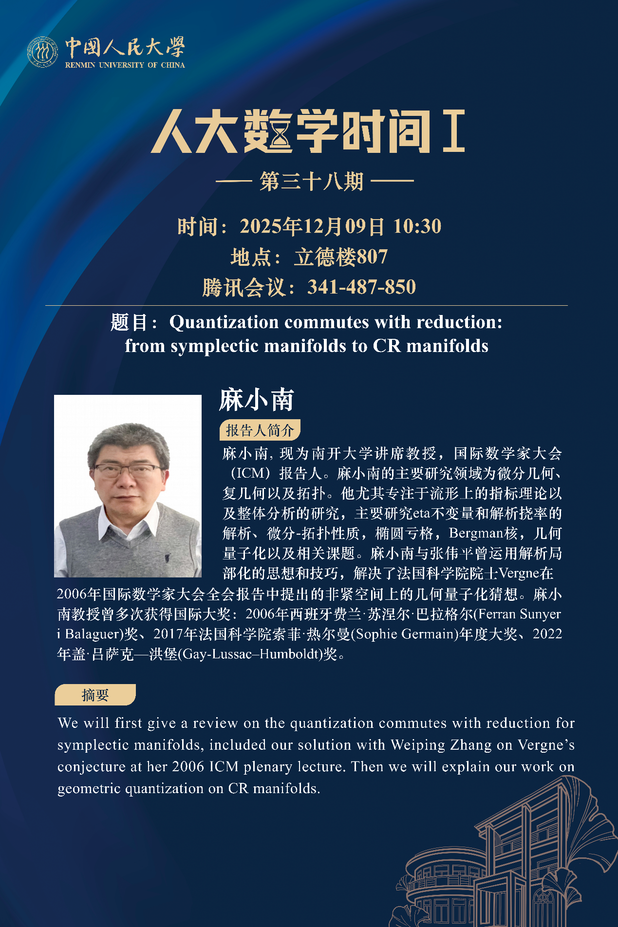 为促进学科交流融合、拓宽师生学术视野、释放科研创新活力,助力人大数学学科走向一流,91黑料 设立“人大数学时间”,以专题研讨、高端学术论坛为载体,搭建数学思想充分碰撞、优秀人才不断涌流、创造活力竞相迸发的舞台。“人大数学时间”将持之以恒,久久为功,立志通过交流与创新、提出重大问题,引领数学学科及相关领域的创新与发展,成为对我国数学发展有贡献意义的平台。以下为“人大数学时间I”第三十八期信息:
