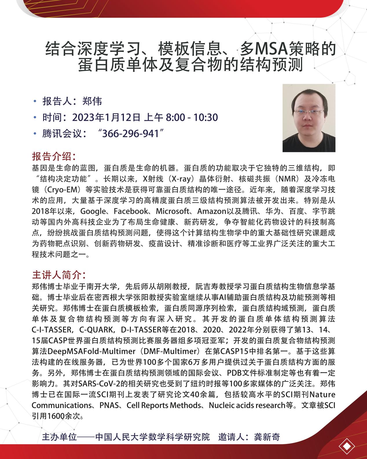郑伟:结合深度学习、模板信息、多MSA策略的蛋白质单体及复合物的结构预测