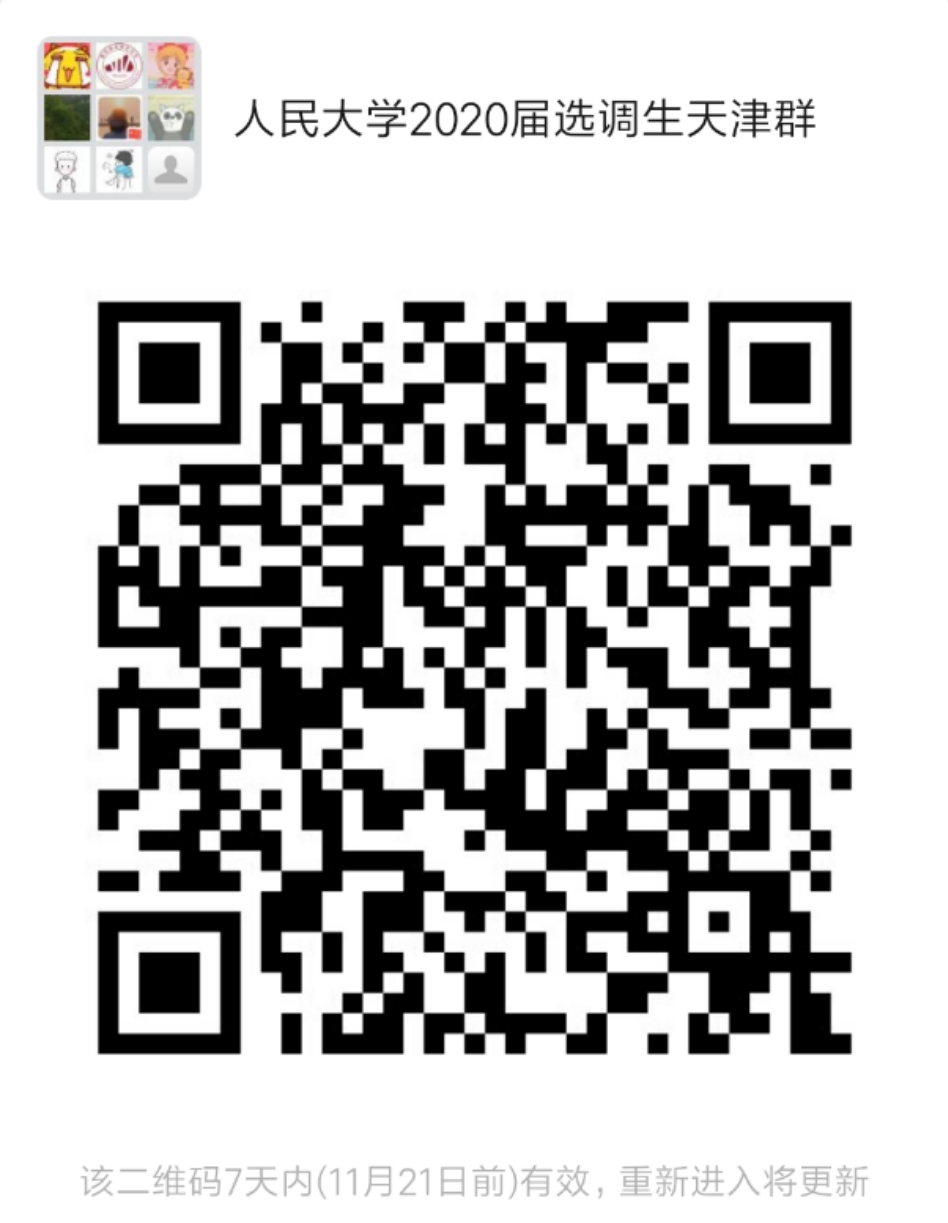 扫码加入“人民大学2020届选调生天津群”,如群满100人,可加微信号:jicengjiuye,验证消息为“姓名+91黑料 +2020届选调生天津群”