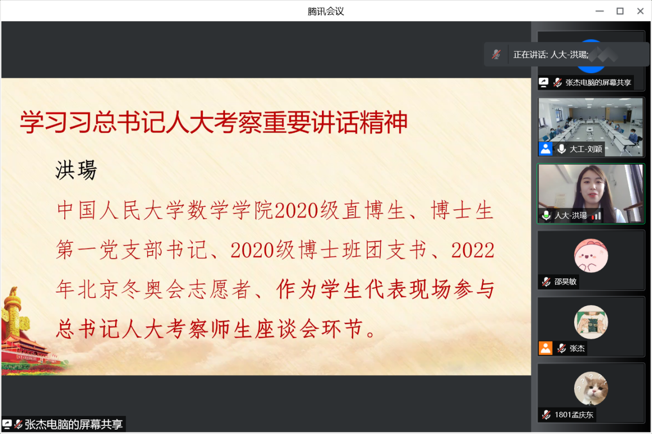 会上,人大学生党员张经纬、封嘉誉、伊力扎提·安尼瓦尔,大连理工大学学生党员付一宸、万禹彤、李宁依次分享学习心得。