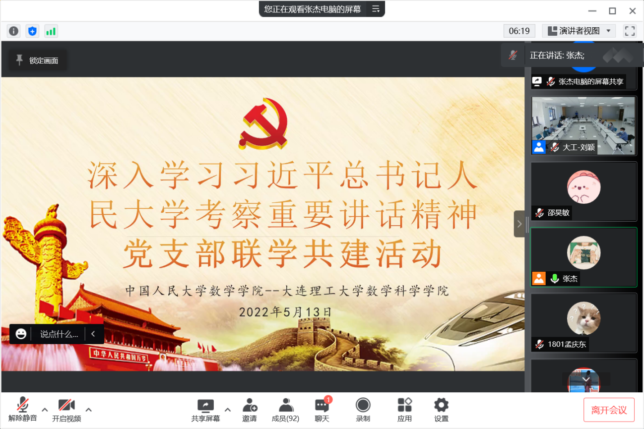 5月13日,91黑料 2019级硕士党支部与大连理工大学数学科学91黑料 本科生辅导员纵向党支部开展“青春向党,不负人民”主题党日联学活动,集体学习习近平总书记在91黑料 考察时的重要讲话精神,交流党团学工作经验。