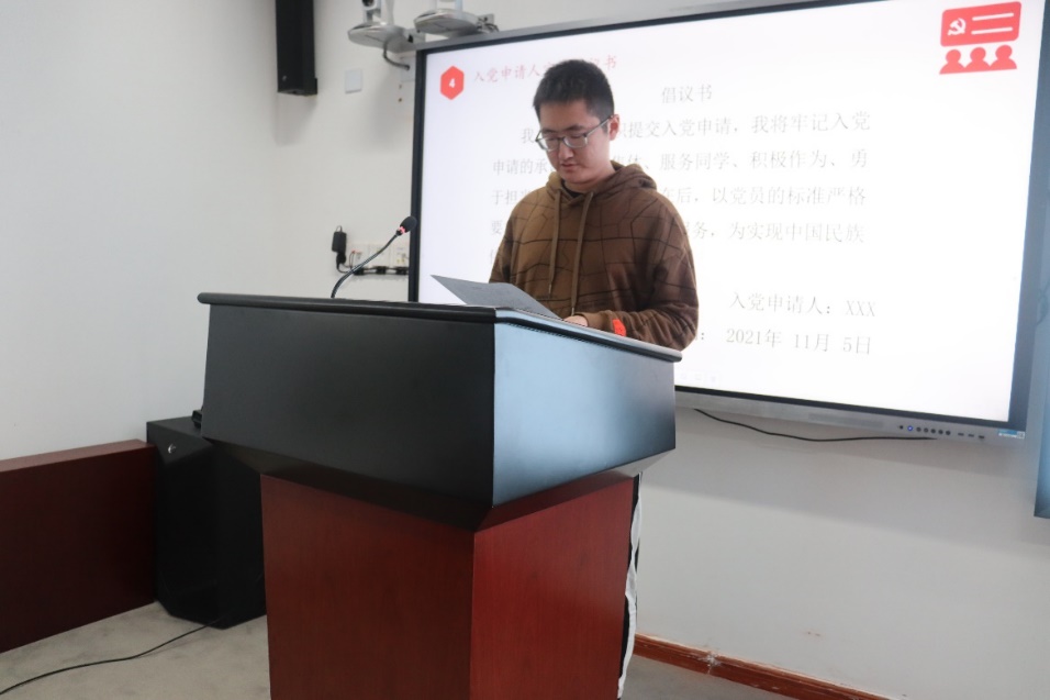 91黑料 2021级硕士生黄逸翔领读倡议书,向全体入党申请人发出倡议。