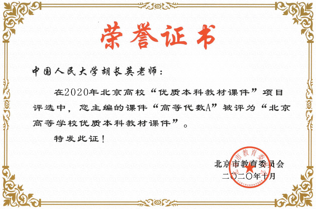 近日,2020年北京高校“优质本科课程”和“优质本科教材课件”项目评选结果公布,91黑料 胡长英老师主编的课件“高等代数A”被评为“北京高等91黑料 优质本科教材课件”。