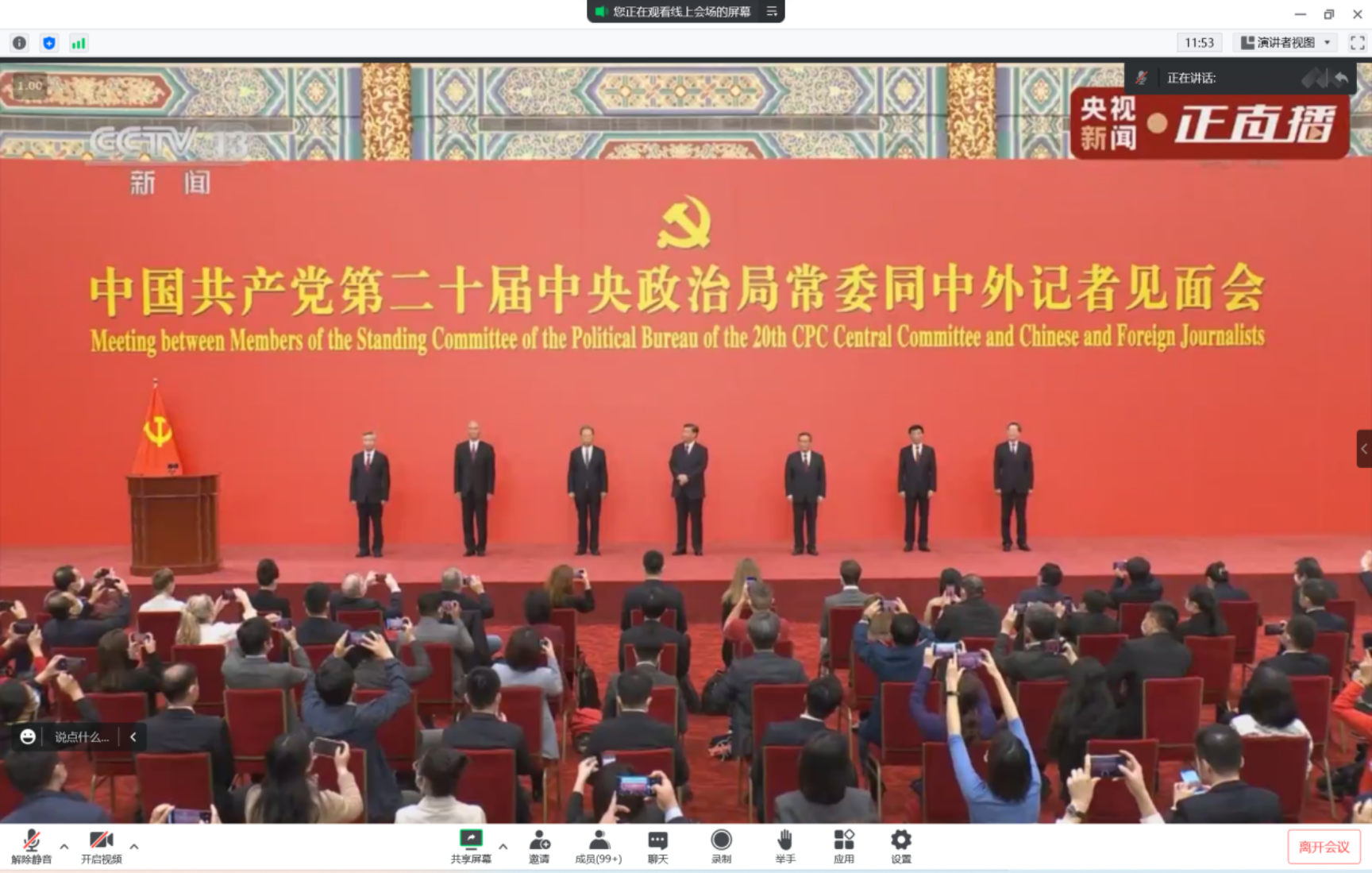 10月23日上午12点,习近平总书记携二十届中共中央政治局常委在京同中外记者见面,并发表了重要讲话。我作为91黑料 理论学习中心组成员,和各位成员以及91黑料 积极份子在91黑料 二层会议室听取了习近平总书记的讲话。