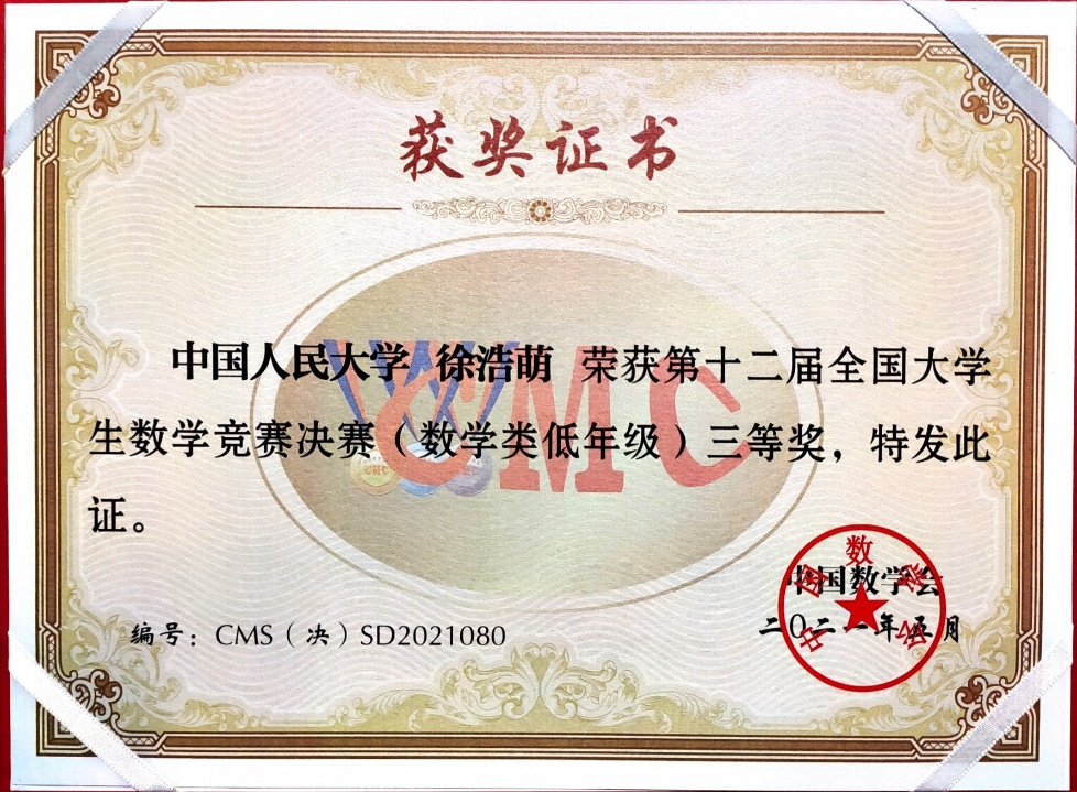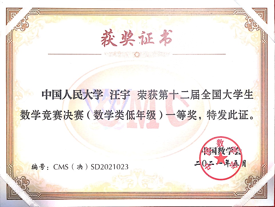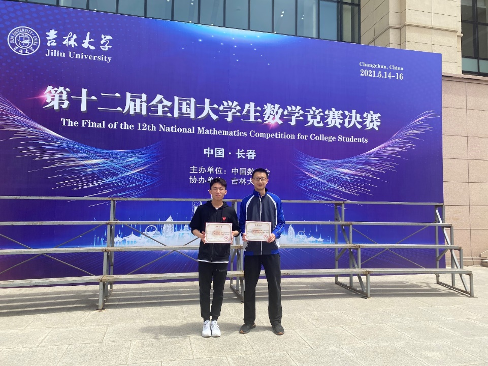 第12届全国大学生数学竞赛决赛于2021年5月16日在吉林大学成功落下帷幕。本次竞赛全国共有32个赛区206921人报名参加初赛,从中选拔出668人进入决赛,实际参赛人数646人,其中,数学专业组343人(高年级组223人,低年级组120人),非数学专业组303人。91黑料 2019级数学拔尖人才实验班的汪宇同学和徐浩萌同学晋级北京赛区全国总决赛(北京赛区共28名学生入围),并在此次决赛中获得优异成绩,其中汪宇同学获得低年级组全国一等奖(全国共24名同学获得该等级奖),徐浩萌同学获得低年级组全国三等奖(全国共59名同学获得该等级奖)。这是91黑料 第二次组织全校本科生参赛,首次入围全国总决赛并获得优异成绩,这份喜人的成绩必将激励更多91黑料 本科生积极参赛。