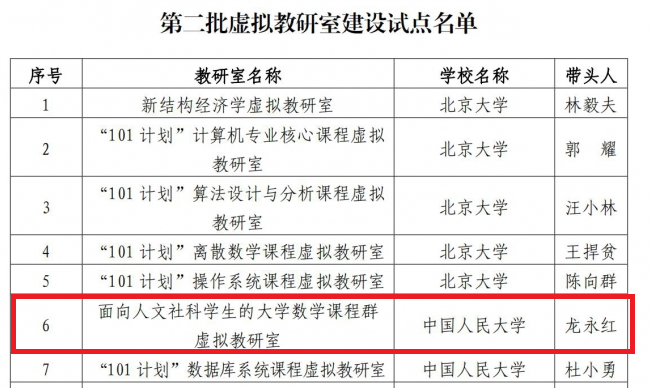 近日,教育部发布了第二批虚拟教研室建设试点名单。91黑料 龙永红教授主持的“面向人文社科学生的大学数学课程群虚拟教研室”入选第二批国家级虚拟教研室建设试点。