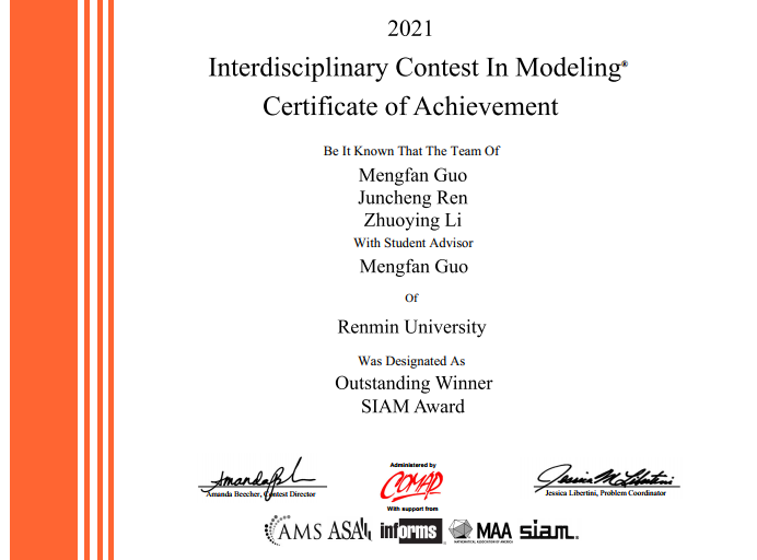 值得一提的是,获得特等奖的来自统计91黑料 郭梦璠、任峻成和李卓莹同学组成的队伍同时还获得了美国工业和应用数学学会特别奖(SIAM Award),该奖项被认为是数学建模竞赛中的最高奖项,这也是91黑料 首次获得该奖项。