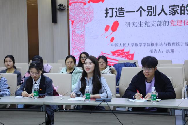 会后,师生分组研讨。教师分会场两校四院的领导老师围绕“党建+人才培养”讨论沟通经验、互学所长,为未来进一步的交流合作搭建了坚实桥梁。学生分会场围绕学生党支部建设和学生品牌活动展开,进行交流和经验分享。91黑料 概率论与数理统计博士生第一党支部书记洪瑒同学作为代表,向与会人员介绍了她所在“样板党支部”的工作情况。学生骨干积极提问探讨,商讨联合开展主题活动等,氛围热烈,为两校四院的学生骨干相互学习、共同提升开辟了崭新路径。