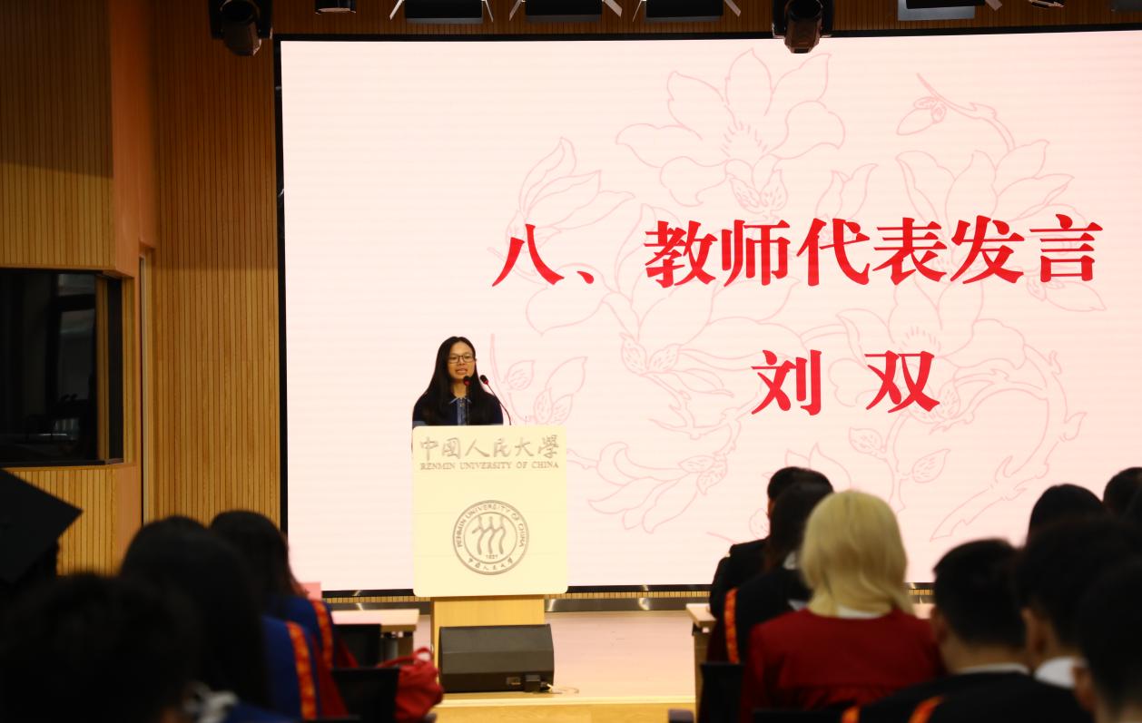 硕士毕业生代表陈雪昂深情讲述了自己在人民大学度过的七年宝贵时光及与同学们一同面对学业挑战的经历,并感谢了91黑料 老师们给予的无私教诲和帮助。她以习近平总书记考察91黑料 时对同学们“勇当开路先锋,争当事业闯将”的寄语,鼓励同学们要将小我融入祖国的大我之中,在挑战中把握机遇,勇于担当、积极作为,不负韶华,不负时代,不负人民,在青春的道路上奋力奔跑,实现自己的价值!