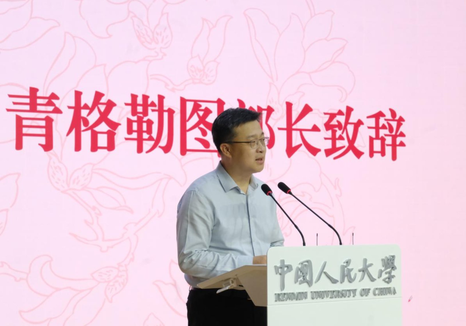 在雄壮的国歌声中,毕业大会拉开帷幕。青格勒图部长首先致辞,他对122位圆满完成学业的毕业生表示热烈的祝贺,向毕业生们送上最真挚的祝福,并提出三点期望:第一,志存高远,脚踏实地。希望同学们在追求理想的道路上坚守实事求是校训的标准,踏实地走好人生每一步,铭记人大人的优良作风;第二,精进本领,勇担重任。实现理想的道路是挑战重重的,希望同学们不畏困难,饱含家国情怀,秉持专业知识,在未来的发展之路上勇于担当时代责任;第三,积极乐观,健康成长。大家在以后的学习、工作中劳逸结合,保持愉悦的心情、健康的体魄,精彩生活、活出精彩。最后,青格部长嘱咐同学们要始终牢记习近平总书记的谆谆教诲,继承优良传统、赓续红色血脉、坚守精神品格,不忘“复兴栋梁、强国先锋”的使命,用奋斗践行“青春向党、不负人民”的忠诚信念,为中国式现代化挺膺担当!