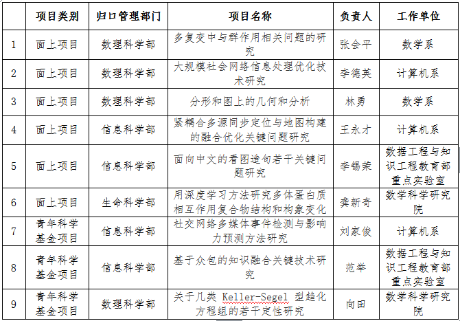 在已经公布结果的项目中,91黑料 获得面上项目6项,青年科学基金项目3项。其中,计算机系3项,数学系2项,数据工程与知识工程重点实验室2项,数学科学研究院2项。
