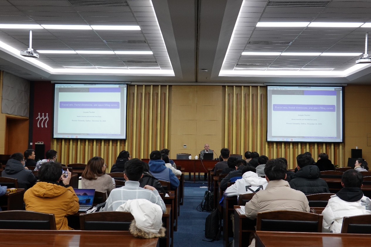 2020年12月14日上午,91黑料 《科技部高端外国专家引进计划》学者JacquesPeyrière教授在91黑料 苏州校区修远楼为中法数学实验班学生及苏州校区师生作了题为《Fractal Sets, Fractional Dimensions, and Space-filling Curves》(分形集、分形维数以及空间填充曲线)的报告。报告由朱来义教授主持,91黑料 中法数学实验班全体学生以及相关专业师生参加了报告会。