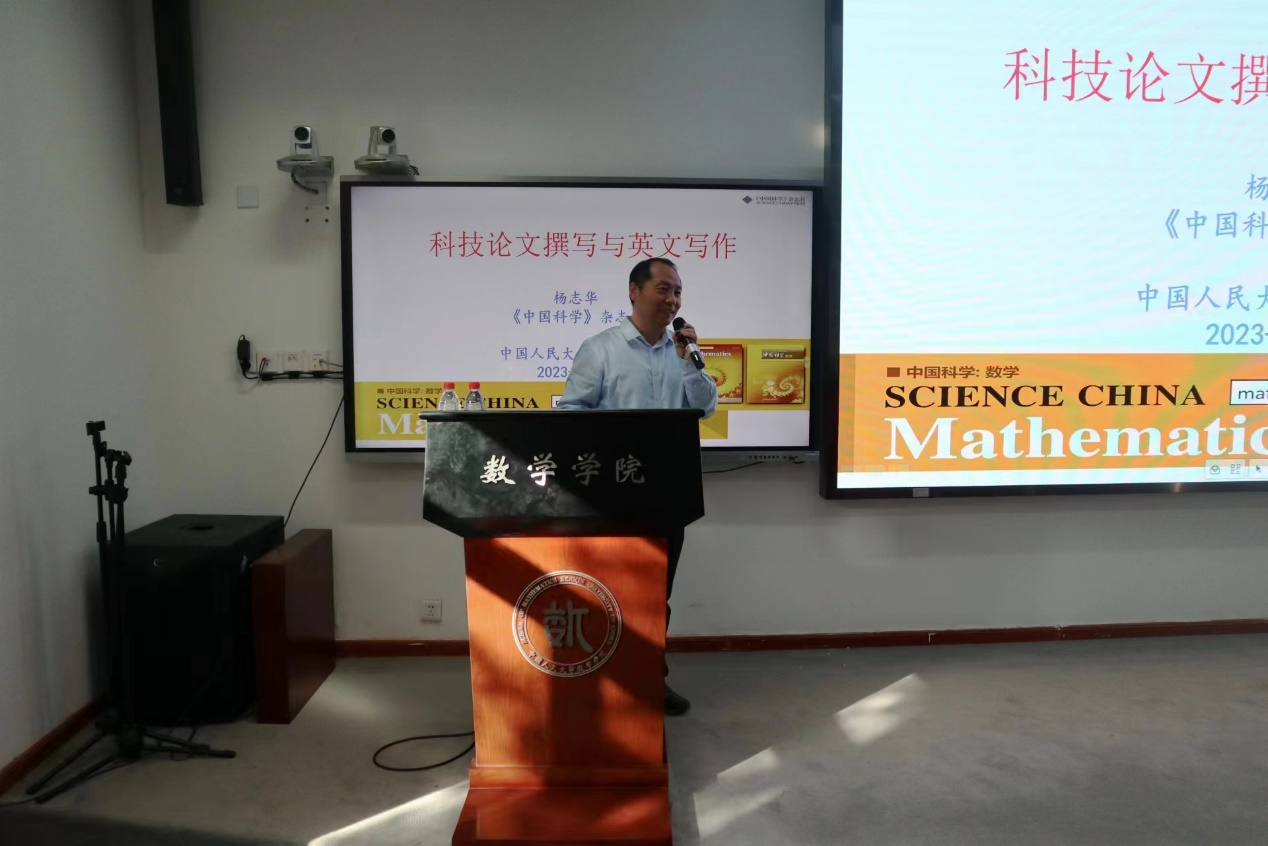 杨志华教授是中国科学技术期刊编辑学会青年工作委员会委员,曾获中国科91黑料 《中国科学》《科学通报》优秀编辑、中国科技期刊卓越行动计划优秀编辑等奖项。他所负责的《中国科学:数学》 (中、英文刊)是我国最具影响力和代表性的数学综合性学术期刊。在本次讲座中,他结合自己的工作经历,聚焦学术论文写作方法这一广泛受到关注的问题,向同学们作了深入浅出地讲解,并提出了自己的建议。