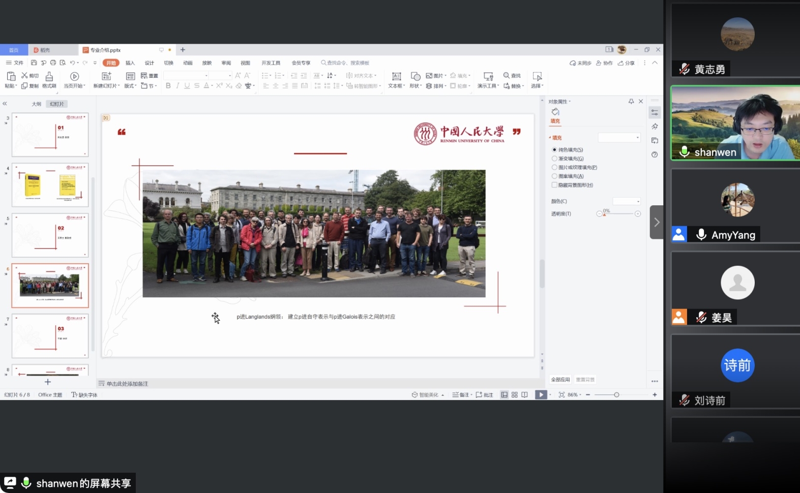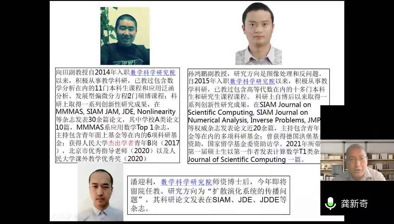 之后,各位老师依次介绍了人大数学学科的研究方向和领域。欧耀彬教授介绍了流体力学方向的相关研究;龚新奇教授介绍了生物数学方向与数学科学研究院的研究团队与研究内容;刘丽光教授针对调和分析方向做了详细介绍;王善文副教授就代数方向分享了独到见解并鼓励同学们努力做一名终身学习者;郑涛副教授介绍了复几何和复流形方向的研究进展;杨云雁教授期待大家能够在偏微分方程方向上快速进入状态并做出贡献;张庆彩教授介绍了以黎曼猜想为代表的复变函数方向;王伟教授就控制论方向做出了精彩的阐述,欢迎同学们加入91黑料 共同探索数学的魅力。