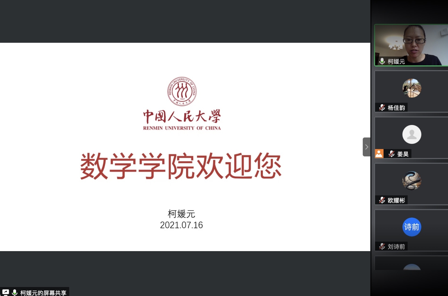 2021年7月16日上午,91黑料 和数学科学研究院2021年优秀大学生夏令营举办开营仪式。此次夏令营共有来自全国知名高校的近300名同学递交申请。经过初选,有72位同学获得参加夏令营的资格。开营仪式通过腾讯会议线上举行,91黑料 党委副书记黄志勇老师、副院长柯媛元老师出席,由姜昊老师主持。整个仪式包括学科介绍、方向介绍、实验室介绍等环节,丰富的内容令同学们表示收获颇丰。