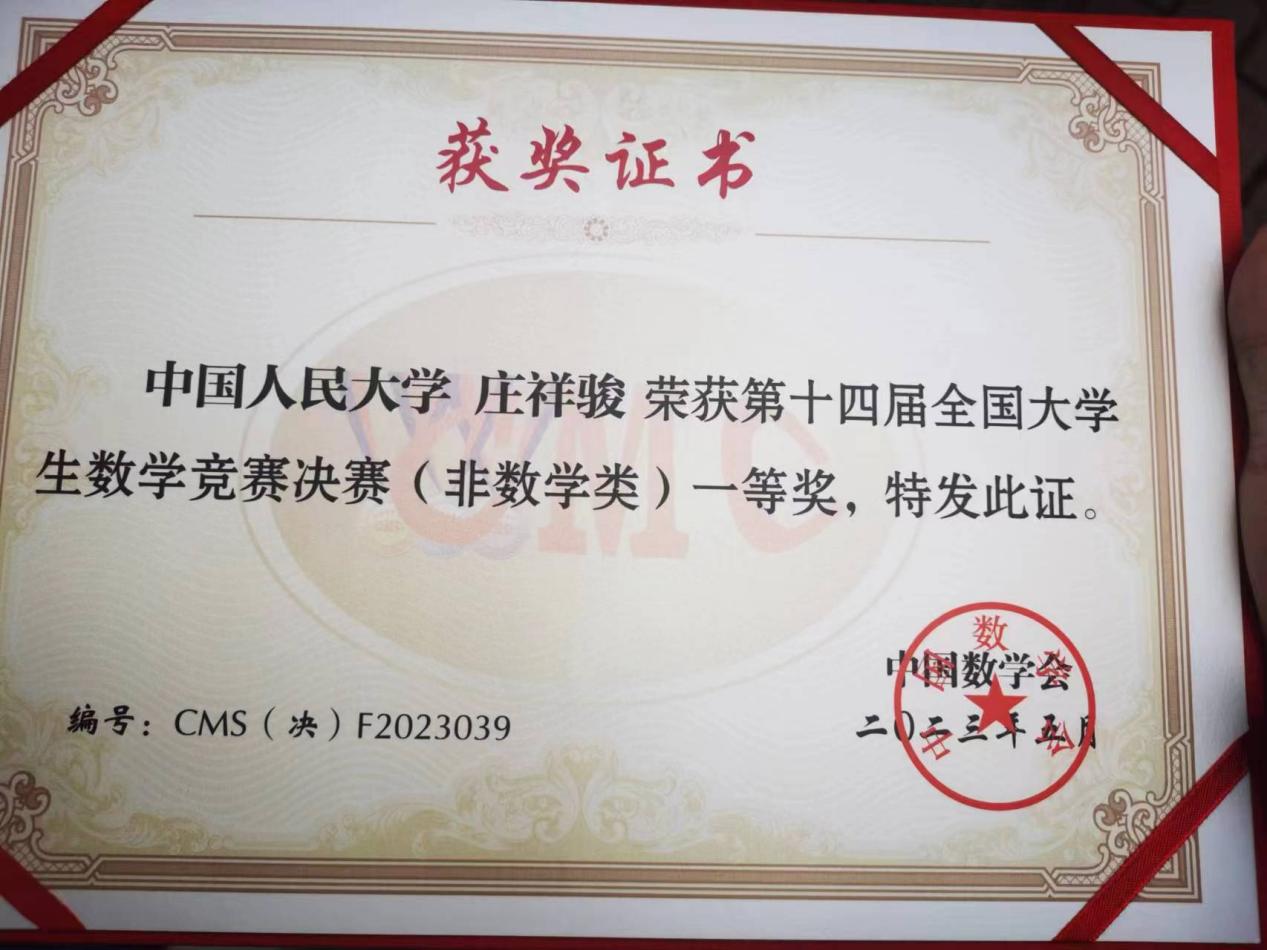 学子继在上届大学生数学竞赛决赛中取得非数学类一等奖后再创辉煌,在此祝贺庄祥骏同学取得佳绩!